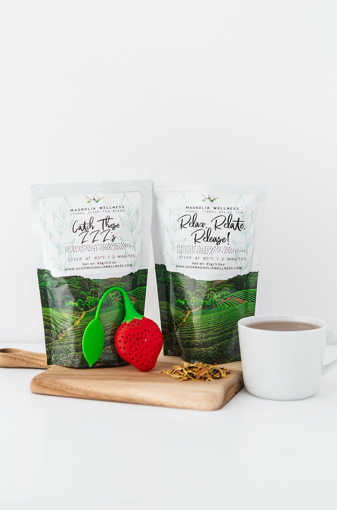 Included in this bundle is our Stress Release herbal tea, Our all natural non-habit forming sleep tea, and a silicone tea infuser.